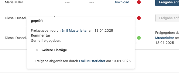 Wurde die Freigabe-/Freigabeablehnung kommentiert, so wird auch der jeweilige Kommentar angezeigt.