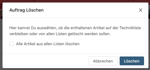 Die Mitarbeiter*innen im Techniklager können nun beim Löschen eines Auftrags entscheiden, ob die darauf enthaltenen Artikel nur aus dem Auftrag oder aus allen verknüpften Listen gelöscht werden sollen.