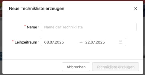 Nach Eingabe des Namens und des gewünschten Leihzeitraums wird über den Button „Technikliste erzeugen“ im Bereich „Meine Techniklisten“ eine leere Liste erzeugt.