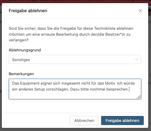 Freigebende können nun bei Ablehnung der Freigabe einer Technikliste eine Begründung angeben.