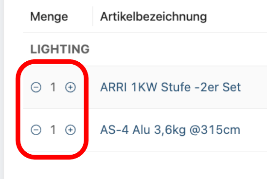 Kontroll-Elemente neben jedem Artikel erlauben das Erhöhen oder Verringern der Anzahl der Einheiten. Wird die Anzahl auf Null gesetzt, wird der Artikel ganz aus der Liste entfernt.