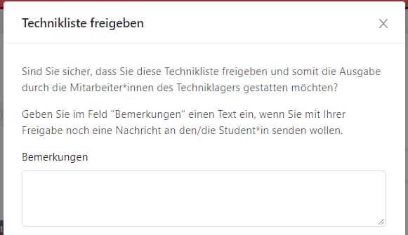 • Personen, welche eine Technikliste freigeben oder ablehnen können haben nun die Möglichkeit, eine Nachricht an den/die Studierende mit Ihrer Entscheidung zu senden.