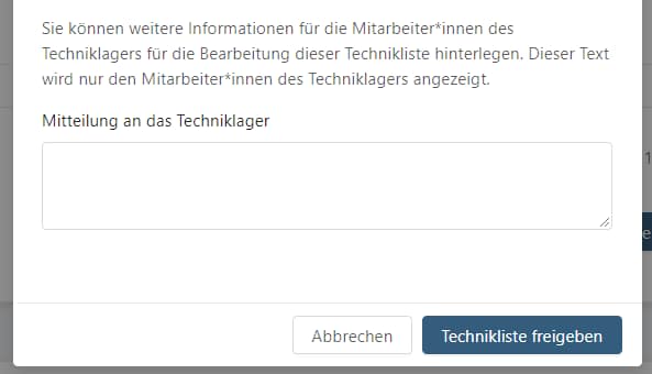 • Außerdem kann eine Nachricht mit der Technikliste an das Techniklager verschickt werden um wichtige Informationen mit der Liste mitzugeben.