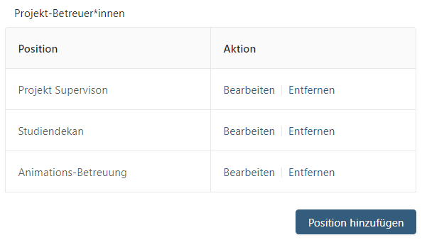 • In einem Projekt können diese Positionen dann einfach über die „bearbeiten“-Seite des Projekts mit Lehrenden besetzt werden, so wie es auch mit Herstellungsleitung und Postproduction Supervisoren funktioniert.