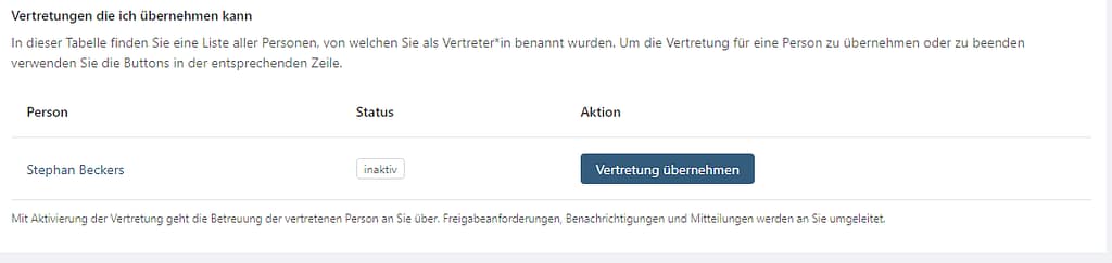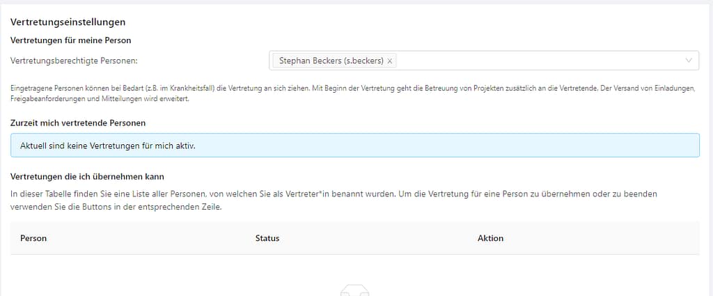 Hier kann ich proaktiv die Vertretung aktivieren, um bspw. auch im Krankheitsfall schnell handlungsfähig zu sein. Ist die Vertretung aktiviert kann meine Person für die vertretende Person Freigaben und Projektaktionen vornehmen. Außerdem bekomme ich als VertreterIn auch alle Benachrichtigungen der vertretenden Person.