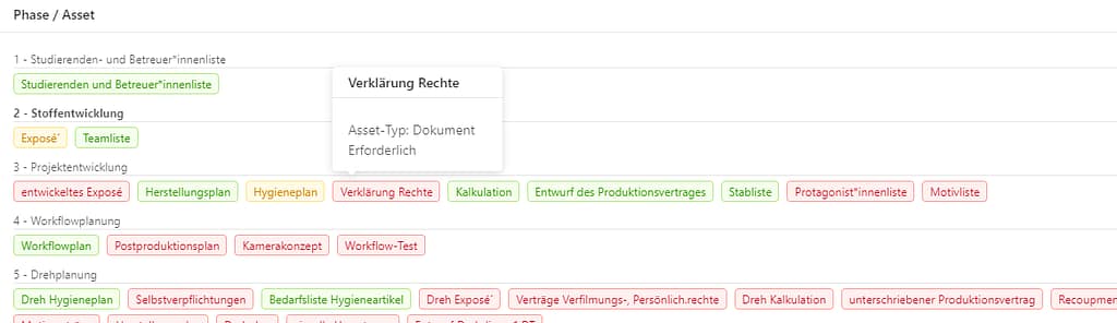 • Auf der Projektdetailseite wird nun mit farbigen Indikatoren angezeigt, welche Assets in einer Projektphase welchen Status haben. Ein Tooltip gibt außderm weitere Informationen über den Status des Asset.