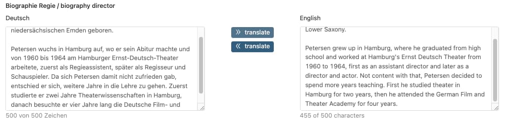 Unter dem Tab „Inhalt“ kann nun eine Biografie der RegisseurIn abgelegt werden.