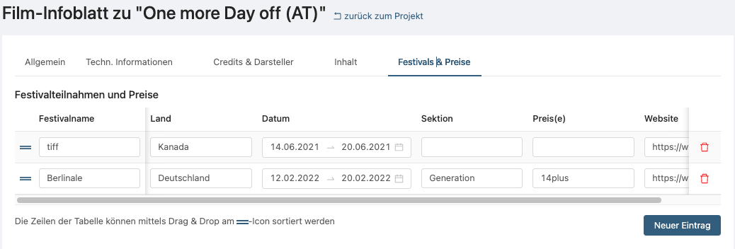 Das Film-Infoblatt hat nun eine Liste, in die Festival-Teilnahmen und Preise eingetragen werden können.