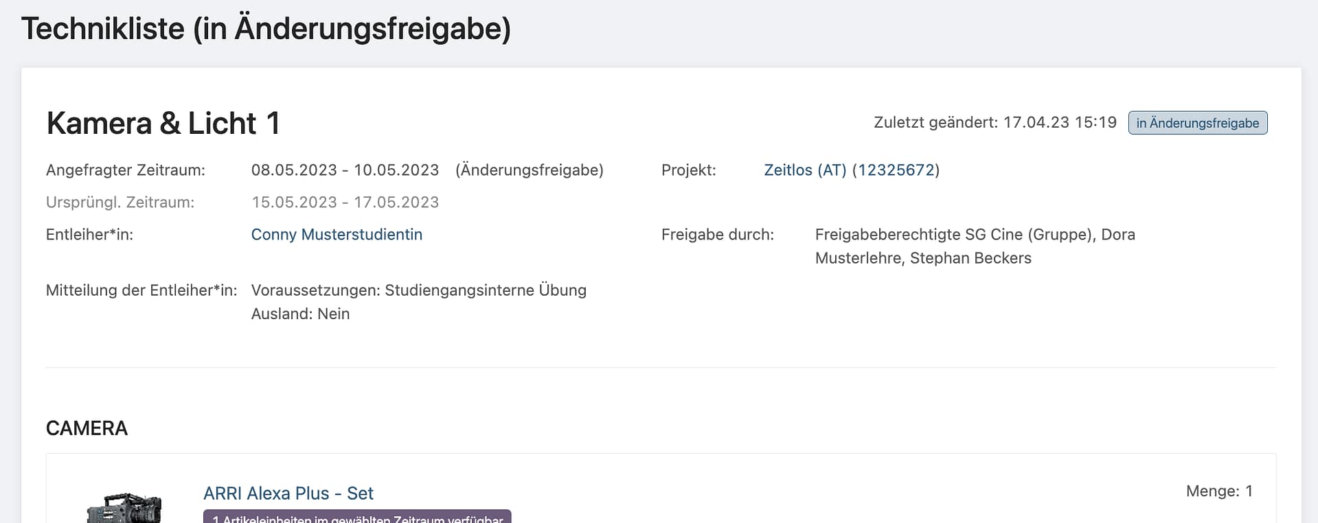 Freigebendes sehen nun unter anderem den Status der Technikliste. Bei angefragten Änderungsfreigaben (Änderung des Leihzeitraums einer bereits freigegebenen Technikliste) wird der ursprünglich freigegebene und der angefragte Zeitraun angezeigt.