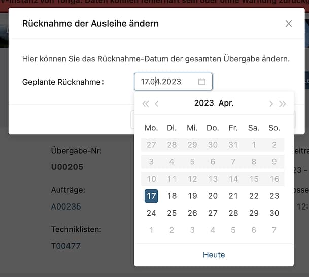 Die Mitarbeiter im Techniklager können den Rückgabetermin während oder auch nach der Übergabe verschieben. Voraussetzung ist, dass die entliehenen Artikel auch im verlängerten Zeitraum verfügbar sind.