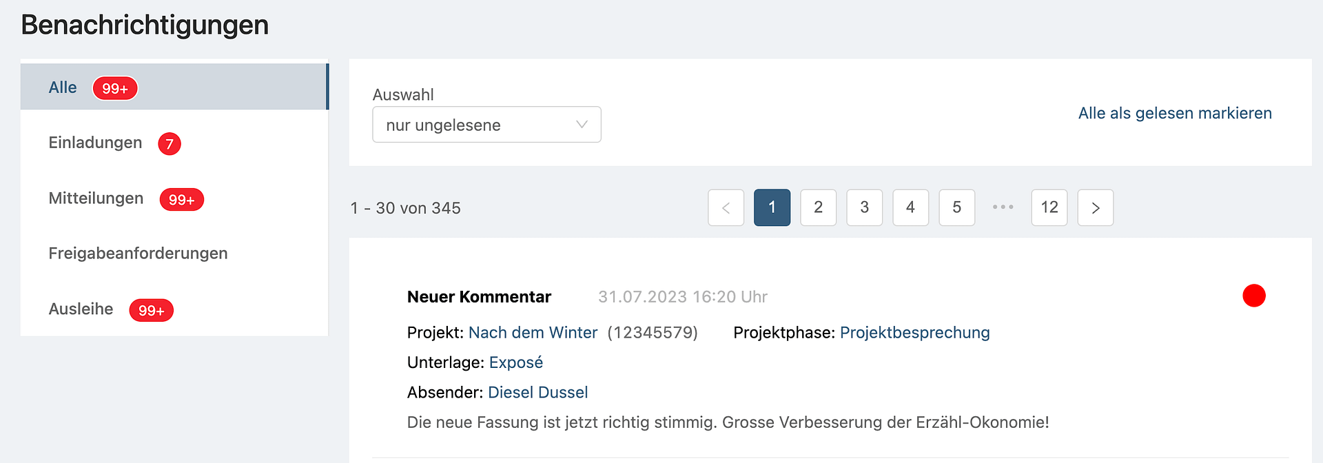 Die Benachrichtigung wird in der Kategorie Mitteilungen angezeigt und entsprechen der individuellen Einstellung per Email versandt.